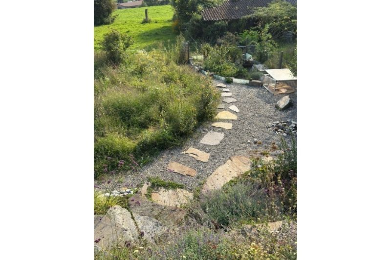 Romantische Bistromöbel auf verlegter Natursteinterrasse
