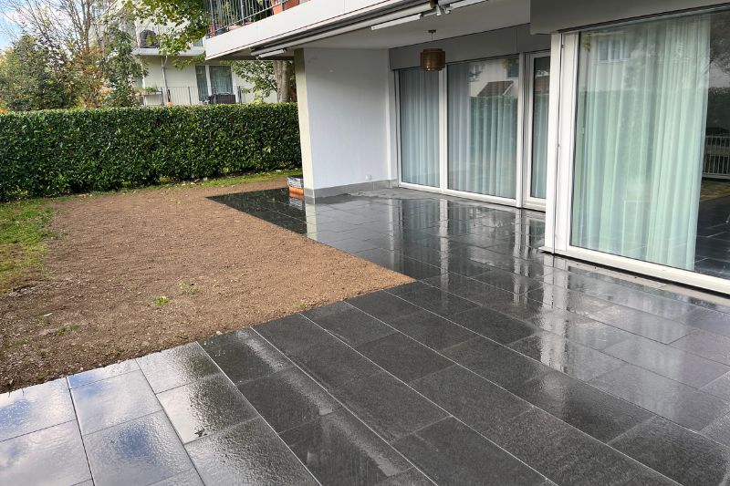 Verlegung der Natursteinplatten, Sitzplatzumrandung und Möblierung